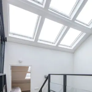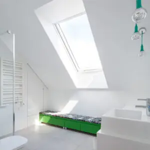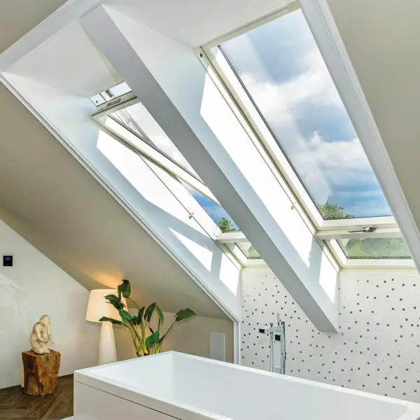 The FAKRO FTU-V P2 Centre Pivot Roof Window combines modern performance with effortless maintenance. Designed with a white polyurethane (PU) coated frame, this roof window is perfect for humid environments such as bathrooms, kitchens, hotels, and hospitals. The vacuum-impregnated pine core is protected by three coats of durable PU varnish, providing a smooth, moisture-resistant surface that’s easy to clean and built to last.